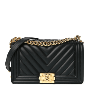 This is CHANEL Calfskin Chevron Quilted Medium Boy Flap in Black. This chic shoulder bag is crafted of chevron-quilted calfskin leather in black. It features a gold chain-link shoulder strap with a leather shoulder pad and a matching boy CC push lock on the front. This opens the bag to a black fabric interior with a patch pocket.