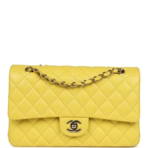 This Chanel medium classic double flap bag is in yellow caviar leather with light gold tone hardware and features a front flap with signature CC turnlock closure, half moon back pocket, and adjustable interwoven light gold tone chain link and yellow leather shoulder strap.