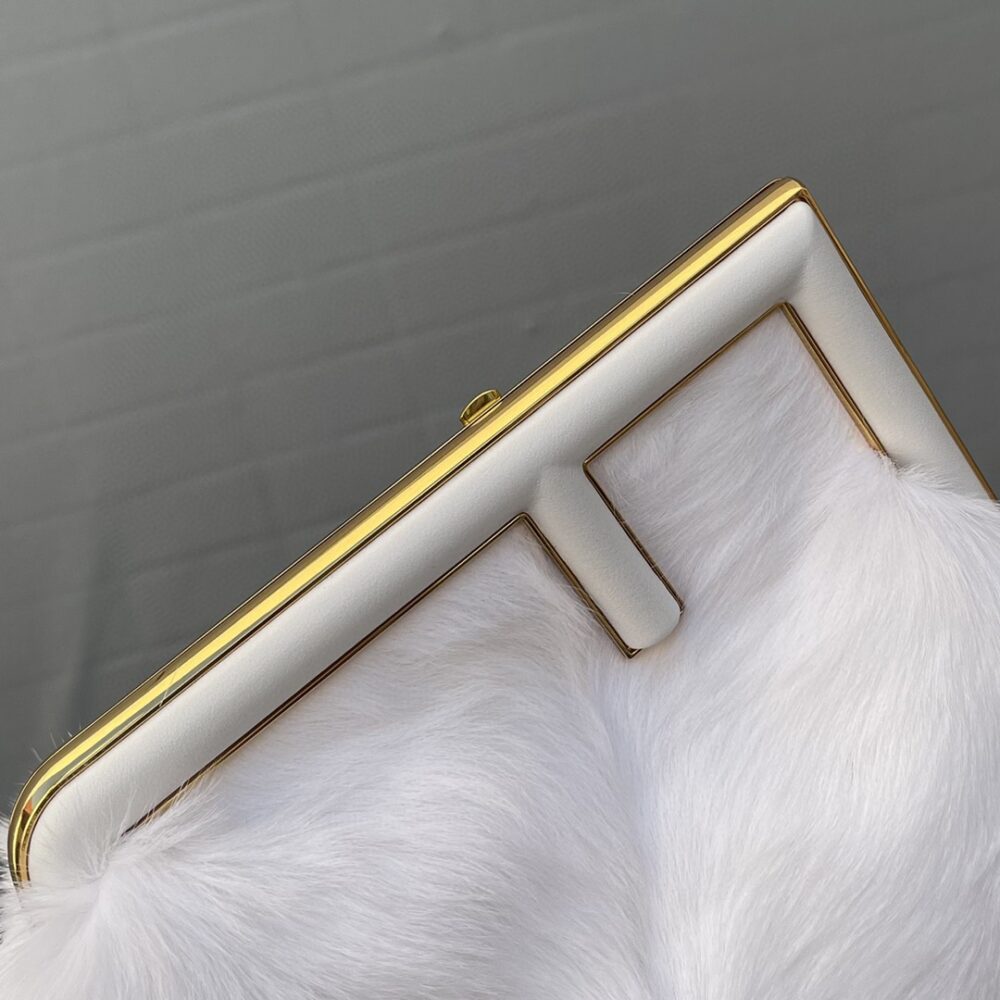 Medium Fendi First bag made of white recycled fox fur patches. Oversized metal F clasp bound in tone on tone nappa leather.