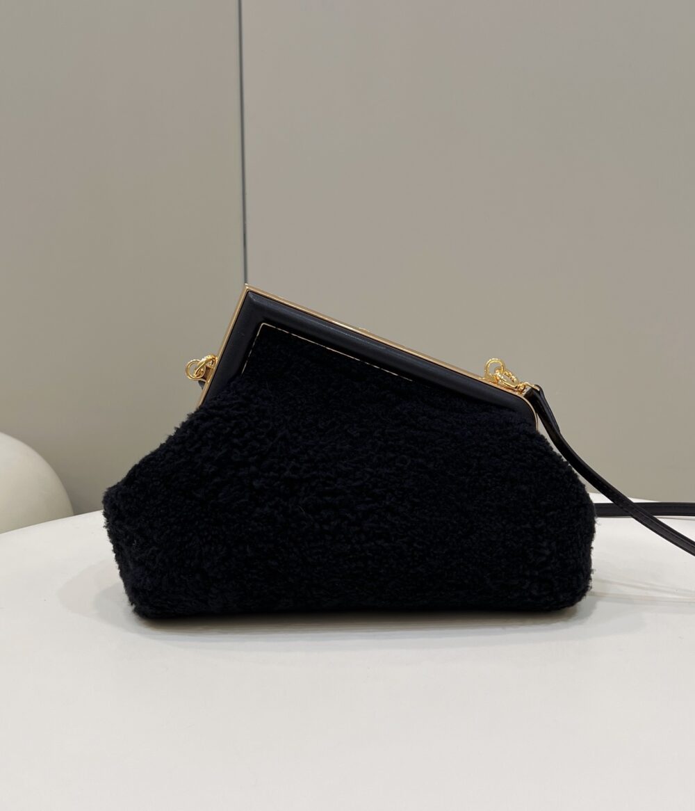 Small Fendi First bag made of soft, pale black mink with oversized metal F clasp bound in tone on tone nappa leather.