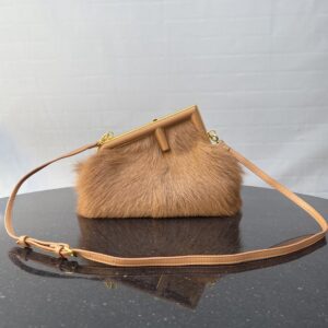Small Fendi First bag made of brown recycled fox fur patches. Oversized metal F clasp bound in tone on tone nappa leather.