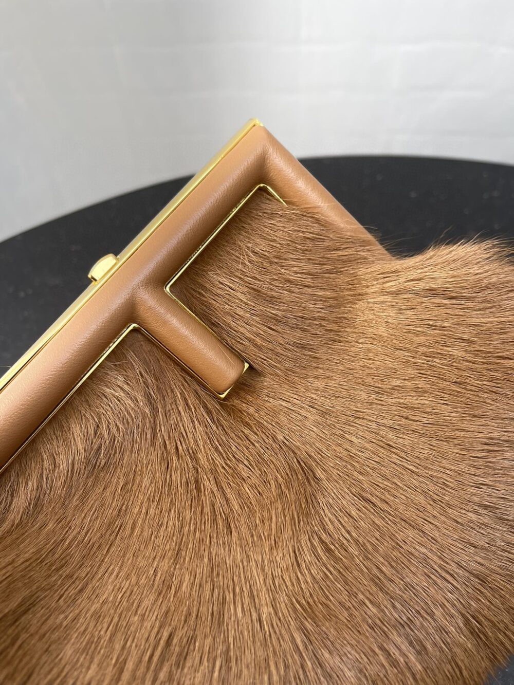 Small Fendi First bag made of brown recycled fox fur patches. Oversized metal F clasp bound in tone on tone nappa leather.