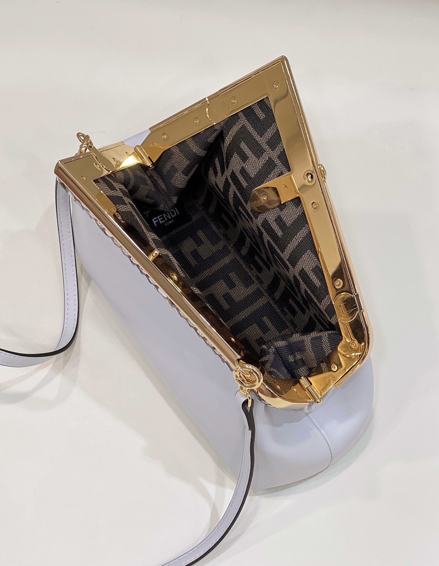 Small Fendi First bag made of soft, white nappa with oversized metal F clasp wrapped in tone on tone python. Can be carried by hand as a clutch or worn on the shoulder thanks to the detachable shoulder strap.
