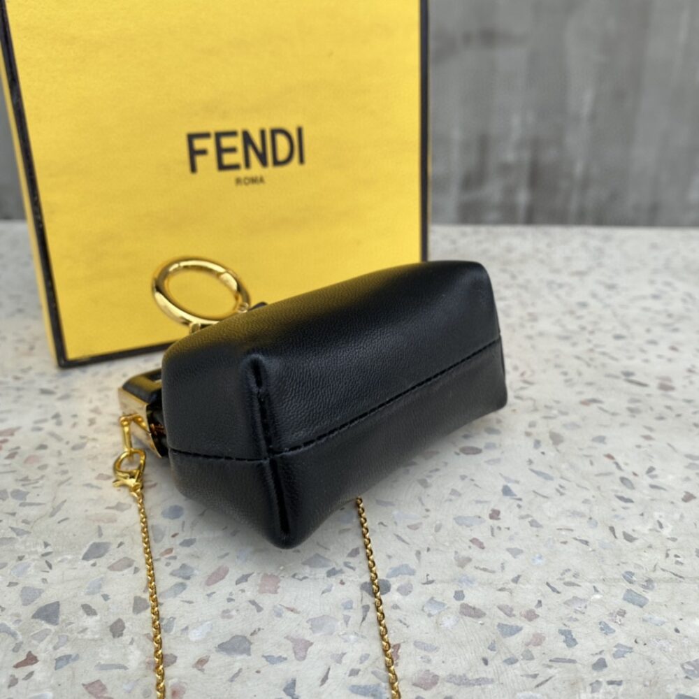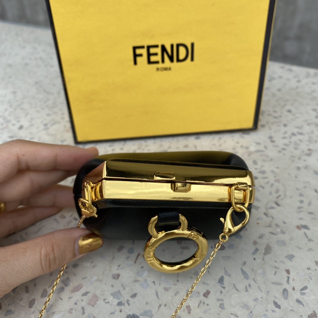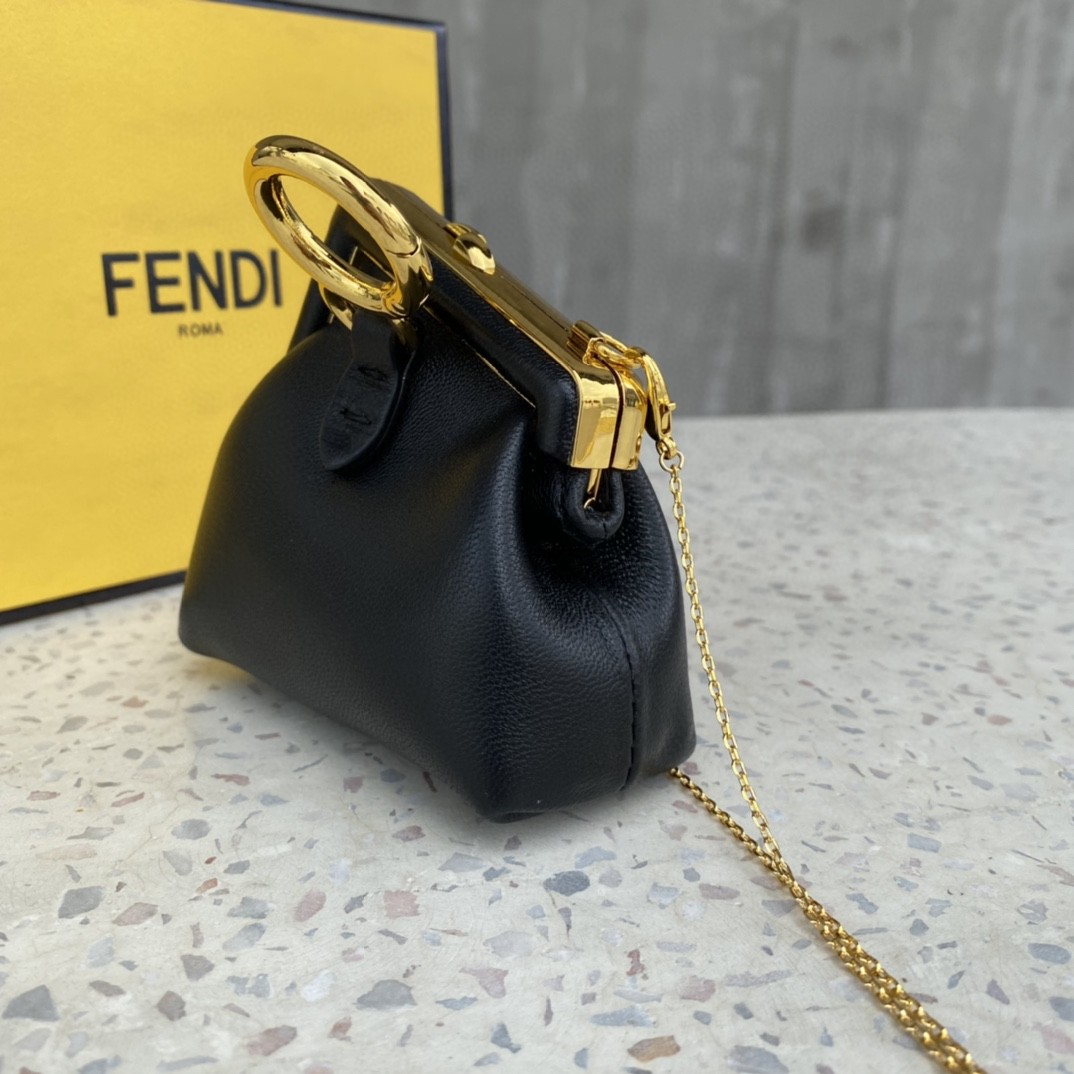 Fendi First Nano bag, with diagonal FF clasp and clip at the back that allows it to be attached to larger bags or belts like a charm. It can also be worn cross-body thanks to the fine chain adjustable shoulder strap. It is the perfect shape to hold AirPods or AirPods Pro wireless earbuds. Made of black. Gold-finish metalware.