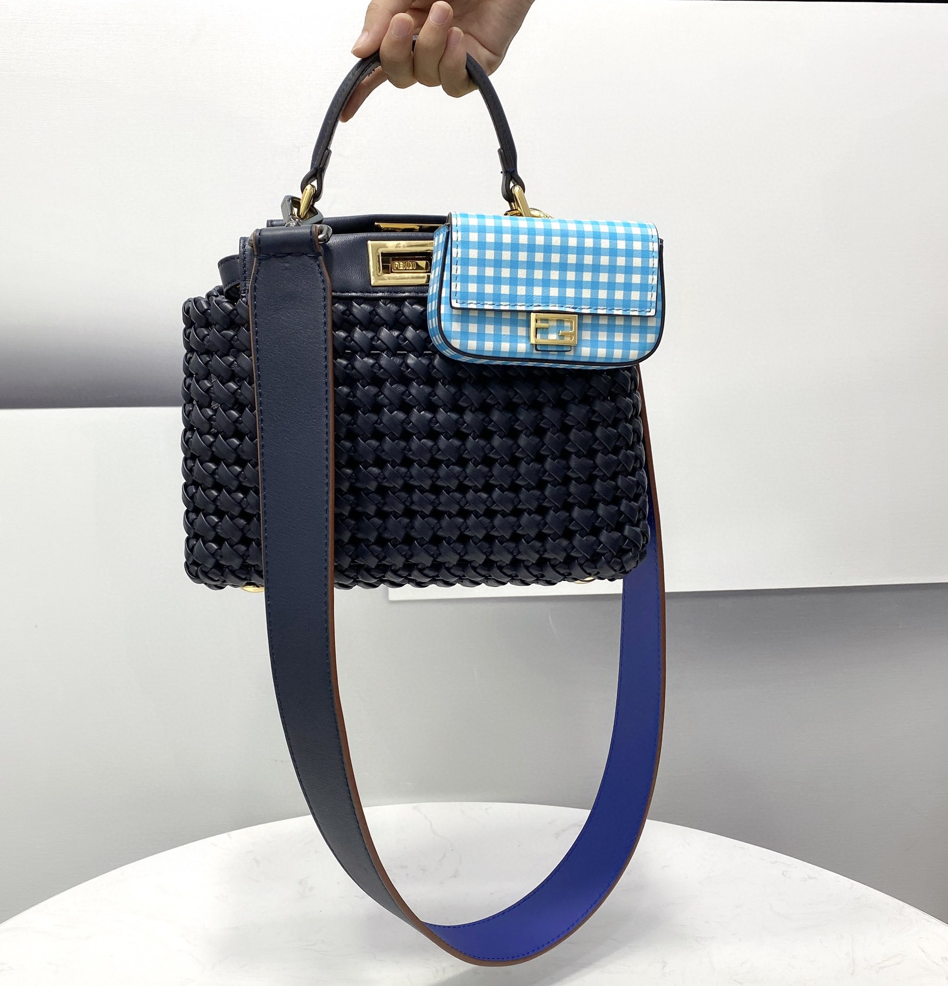 Iconic small Peekaboo bag made of navy blue finely brained leather and embellished with the classic twist lock on both sides.