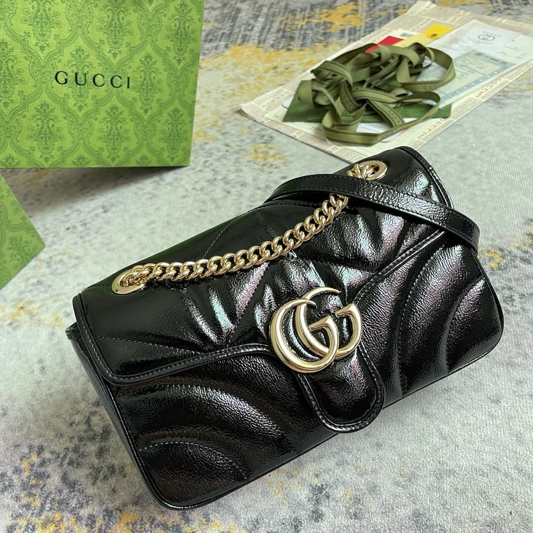 The GG Marmont collection spotlights sophisticated leather in dark tones to welcome Pre-Fall. Crafted in quilted chevron patent leather, this small shoulder bag underlines its contemporary silhouette in black, complete with light gold toned hardware.