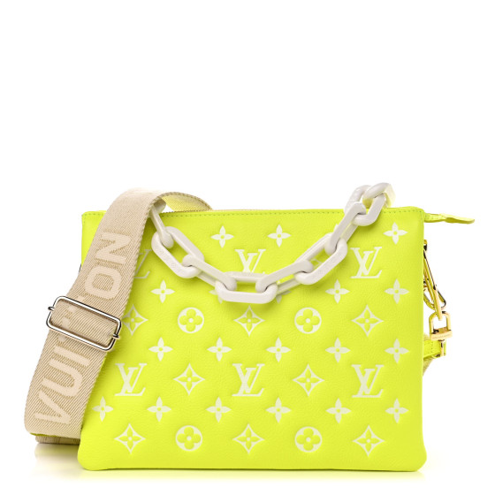This bag is made from Yellow Monogram-embossed puffy calfskin with a chunky chain in contrasting white acetate. The chain enables shoulder carry while a wide shoulder strap allows shoulder and cross-body wear; both are detachable