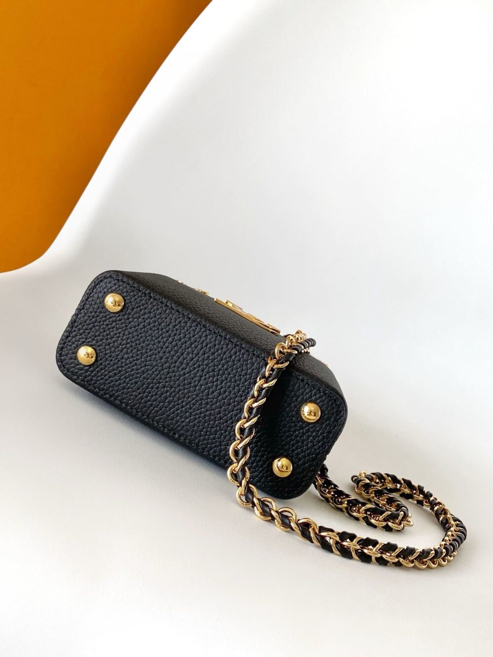 Part of the Capucines Flower Crown collection, the Capucines Nano in grained Taurillon leather is notable for its jewel-like embellishment. Two Monogram Flowers with a shimmering mother-of-pearl finish surround the emblematic LV Initials signature. A removable chain adds to the refinement of this small bag, which will transition seamlessly from day to evening.