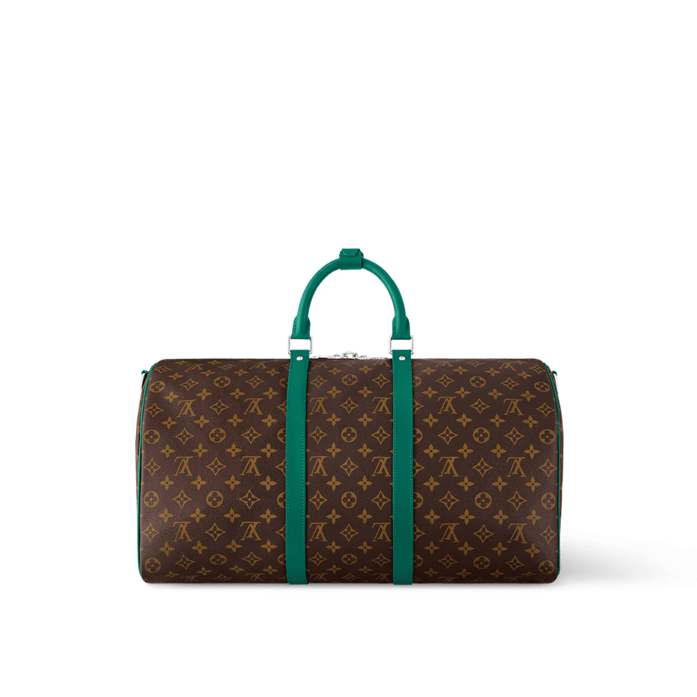 Brightly colored leather details bring a fresh feel to this Keepall Bandoulière 50 travel bag in Monogram Macassar canvas. The top handles, the removable shoulder strap, even the leather name tag, are all in the same bright color. The bag is lined in a striped textile inspired by the linings of the House’s original trunks.
