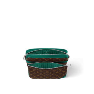 The modular Trio Messenger bag is made from Monogram Macassar coated canvas with hints of colored cowhide leather, specifically the piping that frames the bag. This hybrid bag is composed of a main compartment, a removable front zipped pocket, and a detachable small coin purse attached to the strap’s D-ring.