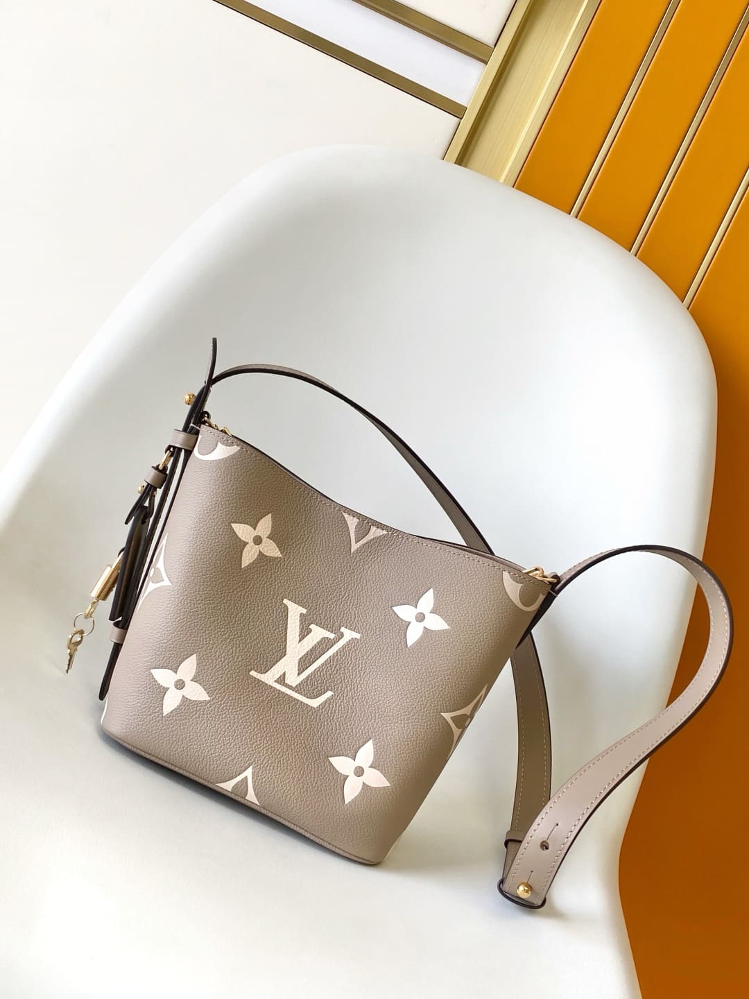This timeless edition of the All In BB encapsulates modern versatility with an elegant design offering ample storage. This sleek bucket bag is crafted from Monogram Empreinte leather in a fresh bicolor palette, elevated with signature details including a name tag and gold-toned padlock. The adjustable handle pays tribute to the House’s trunk-making heritage.