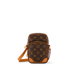 The Amazone is a stylish cross-body bag made from Monogram canvas with aged leather corners, piping, and removable strap. Inspired by designs from the 1980s, Pharrell Williams creates a compact bag that blends vintage charm with modern sophistication. The zip-pulls are adorned with pearl. The adjustable strap ensures comfortable carry.