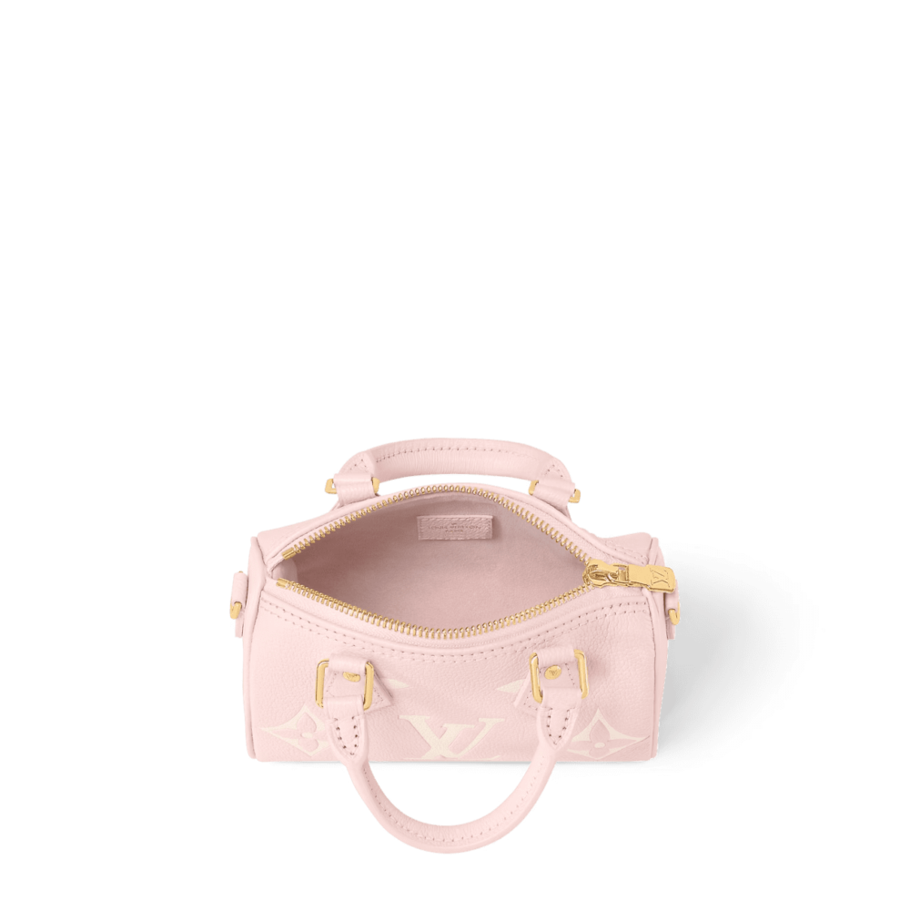 This contemporary edition of the Nano Speedy offers a feminine color palette, which contrasts beautifully with gold-toned hardware. The compact design is crafted from the House’s Monogram Empreinte leather and features a removable laced chain, offering multiple carry options. Use it store day-to-evening essentials.