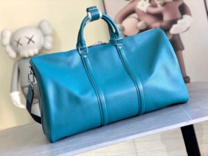 It’s the metallic tone-on-tone LV Initials and distinctive name tag that give it away: this Keepall Bandoulière 50 in grained cowhide-leather is part of the LV Aerogram Collection. This carry-on-size travel bag is easy to carry thanks to its wide strap, both removable and adjustable, with “Louis Vuitton” woven into the textile.