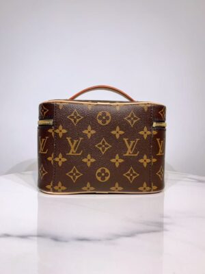 Small and surprisingly roomy, the Nice Nano vanity case can be used to store beauty essentials like nail polish or lipstick in a bathroom, or as a bag inside a bag to keep small items organized. Fashioned from Monogram canvas with a top handle that flattens for easy packing, it easily fits into even tight spaces.