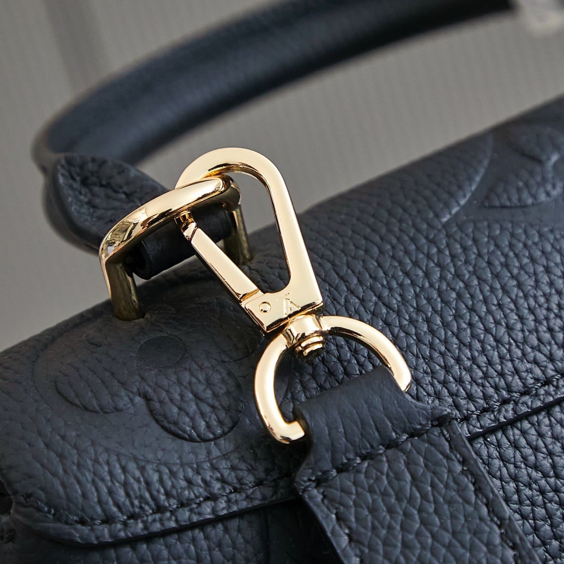 Made from Monogram Empreinte leather, with an oversized Monogram pattern embossed into the leather, this Madeleine BB handbag is a study in elegance. The single, articulated top handle brings a feminine elegance to the bag while the detachable strap enables shoulder and cross-body carry. It’s signed with the House’s classic key bell and S-lock.