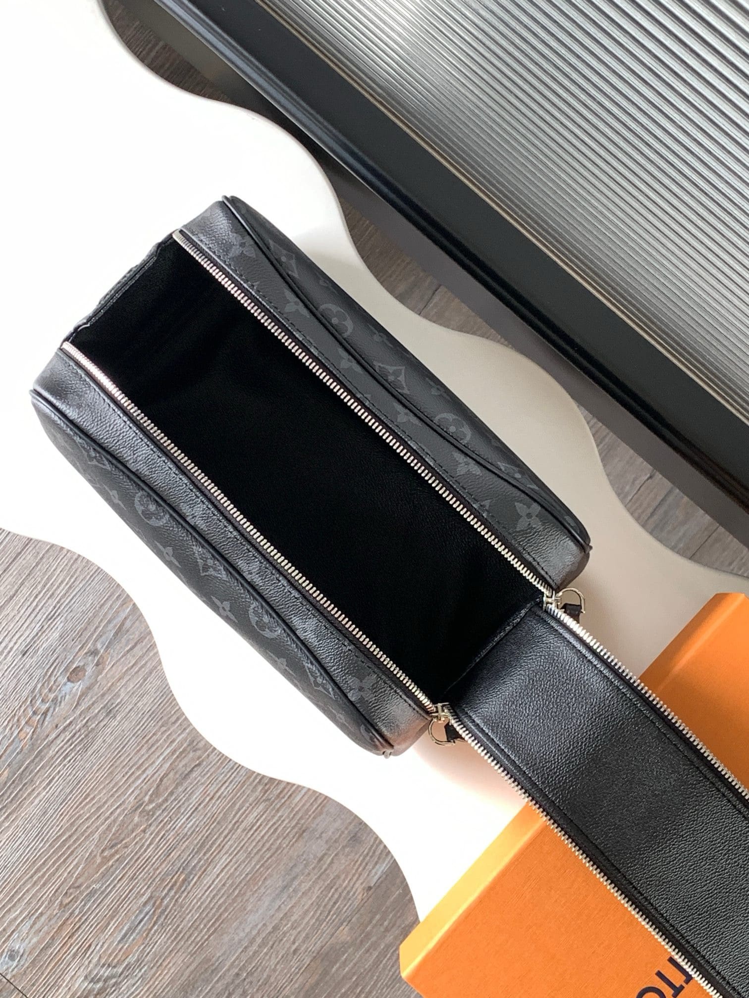 A discreet choice for Monogram lovers, this Dopp Kit toiletry bag in Monogram Eclipse canvas has plenty of room for all your travel essentials, a double zipper for secure protection and a wide opening for easy access.