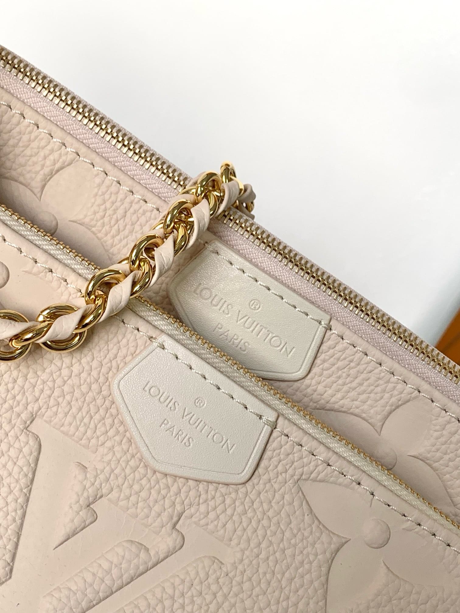 Made from cream-colored Monogram Empreinte leather, the Multi Pochette Accessoires handbag is composed of two pouches attached together. Both pouches are lined with matching cream-color microfiber, with the larger pouch also including an inside pocket. Thanks to a chain and a strap, both removable, this bag becomes very verstaile.