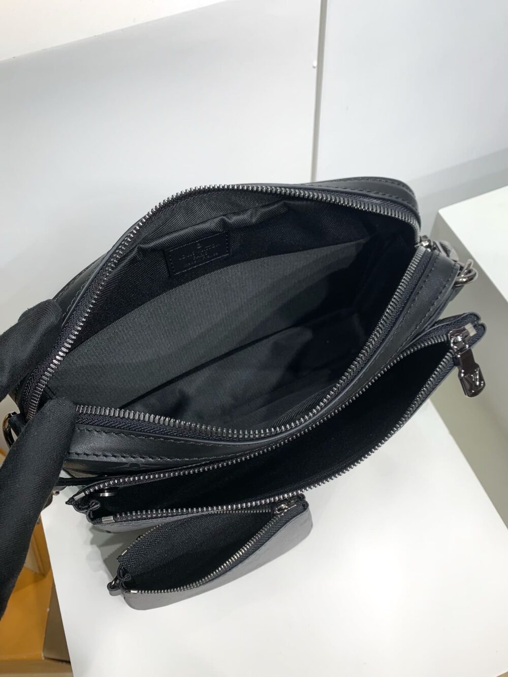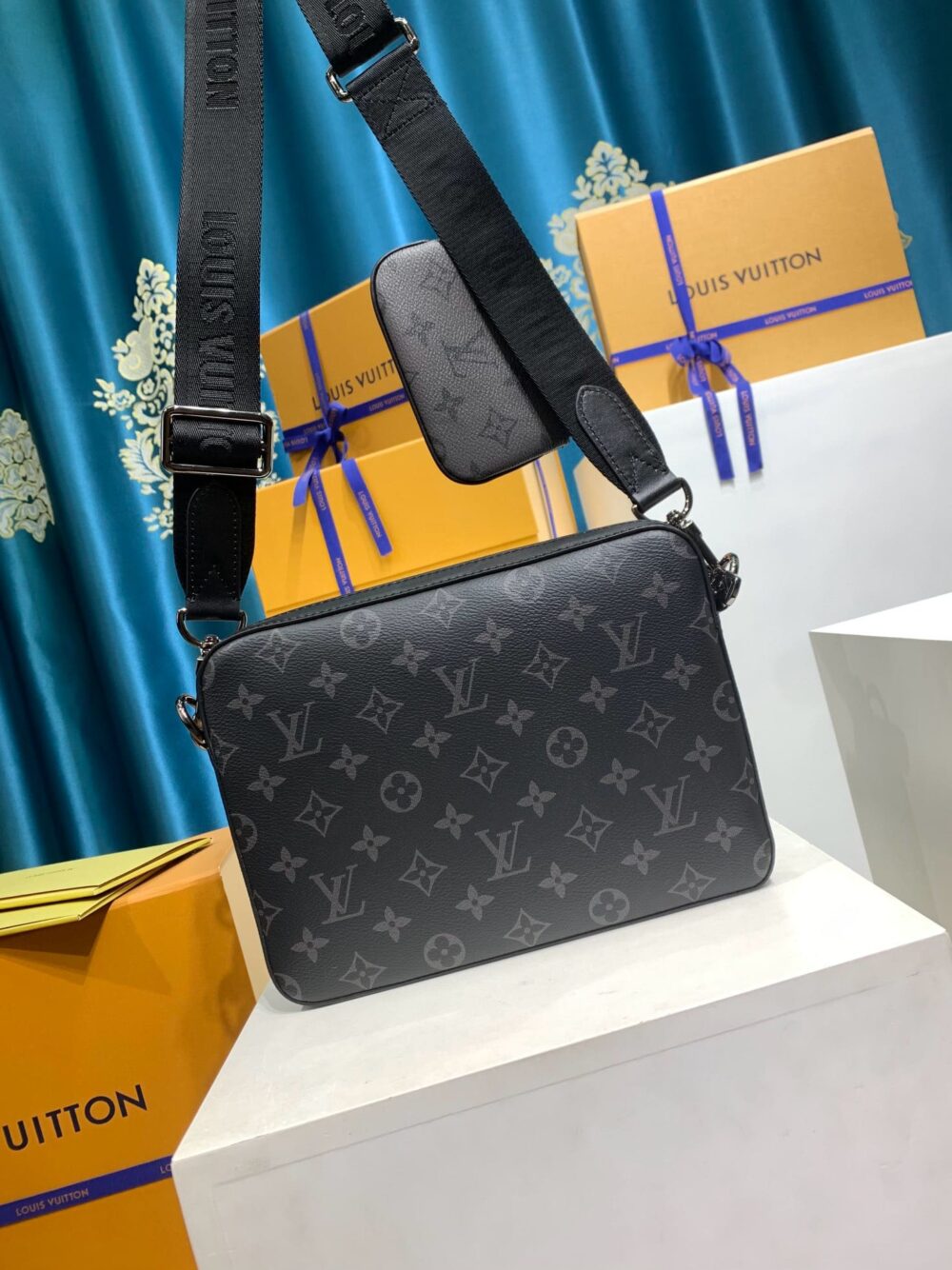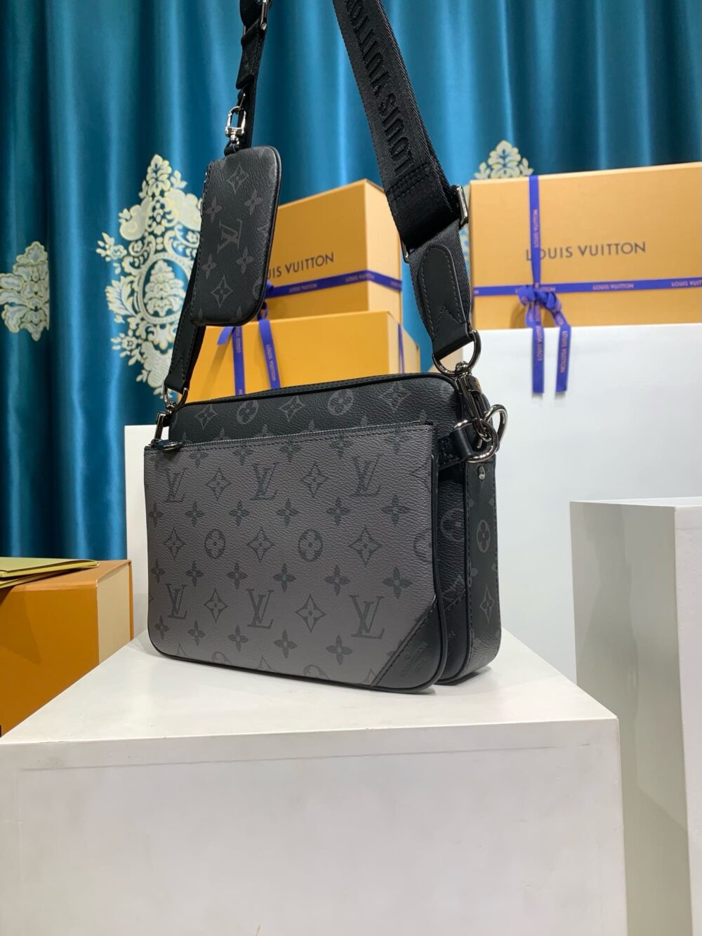 The Trio Messenger bag for men is made from Monogram Eclipse canvas and its mirror twin, Monogram Eclipse Reverse. The iconic motif in tone-on-tone shades of gray complements the lines of this functional hybrid. More than a traditional cross-body bag, it has a removable zipped pocket and a removable coin purse attached to the strap.