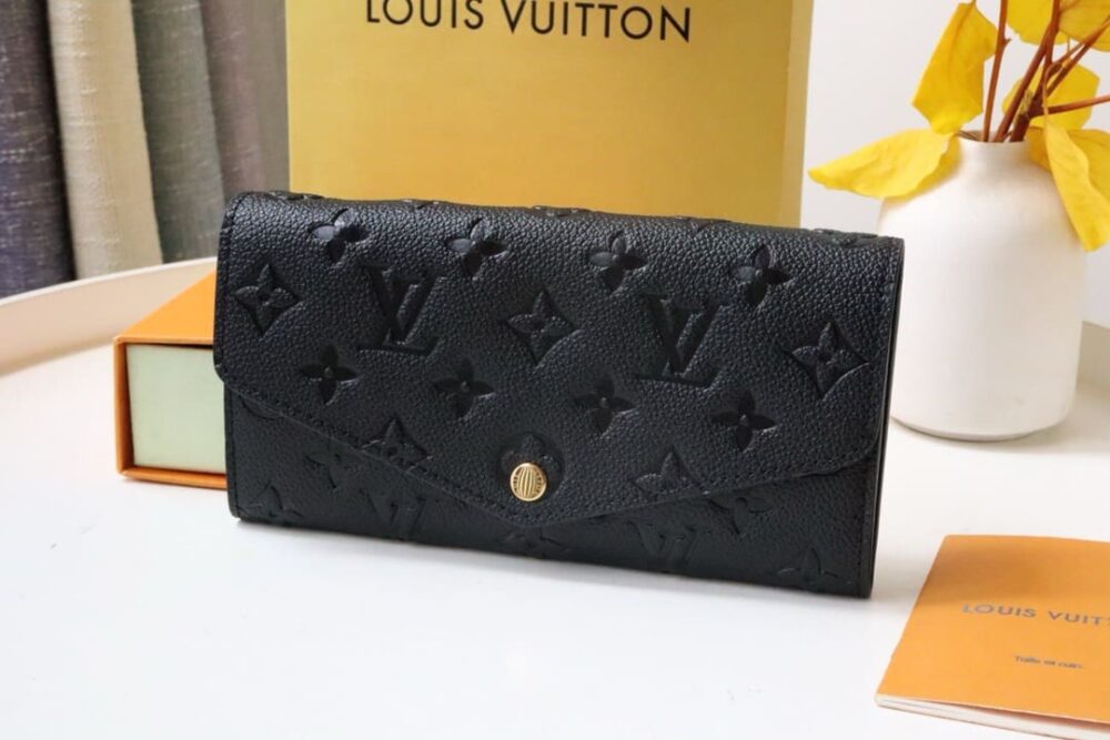 The Sarah wallet is crafted from Monogram Empreinte leather, embossed with Louis Vuitton’s iconic Monogram pattern. The wallet’s envelope-style flap opens to reveal a variety of practical features, including multiple credit-card slots and a zipped coin pocket.