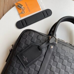 Damier Infini cowhide leather, with its emblematic checkerboard pattern embossed into the leather, brings subtle elegance to this Porte-Documents Voyage PM briefcase. The rolled-leather top handles and removable name tag, also in leather, give it a statutory feel while the adjustable – and detachable – shoulder strap makes it practical.