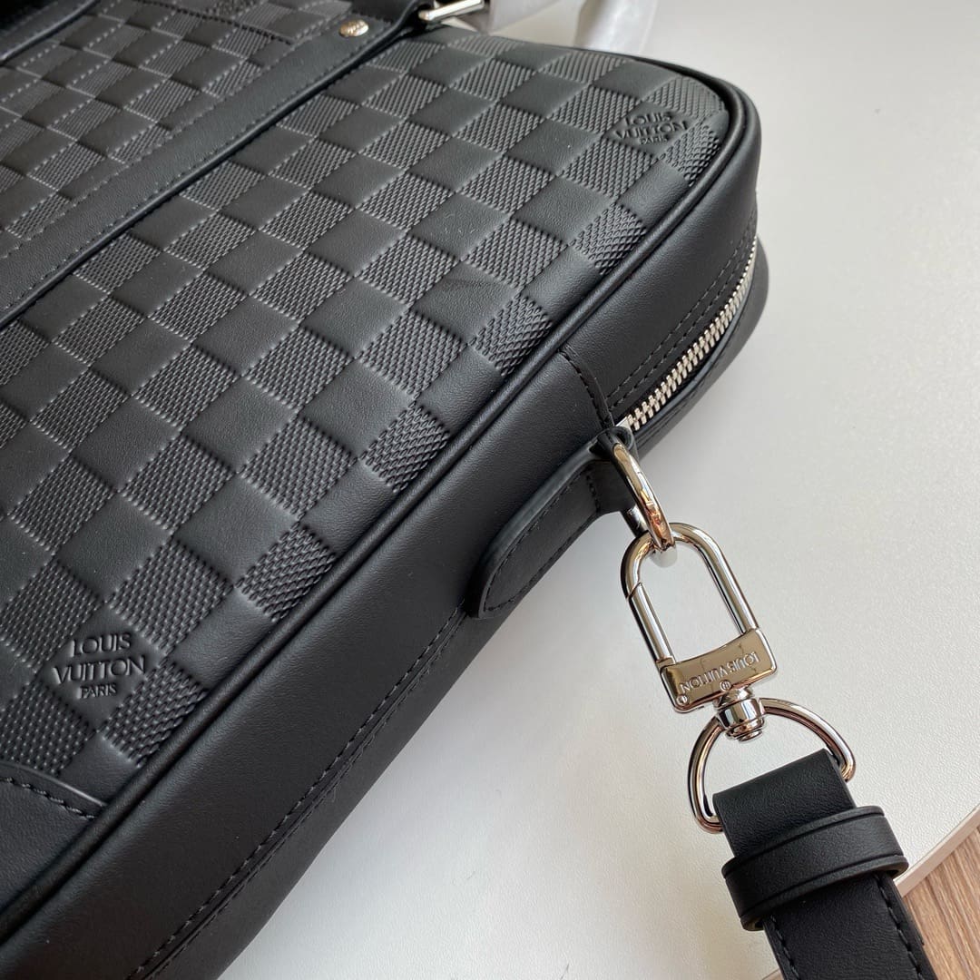 Damier Infini cowhide leather, with its emblematic checkerboard pattern embossed into the leather, brings subtle elegance to this Porte-Documents Voyage PM briefcase. The rolled-leather top handles and removable name tag, also in leather, give it a statutory feel while the adjustable – and detachable – shoulder strap makes it practical.