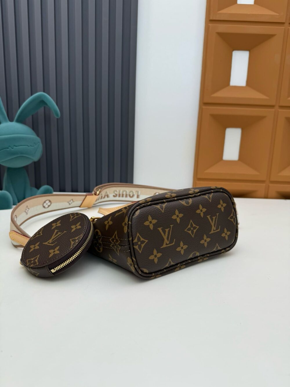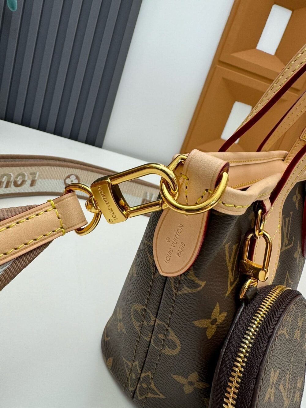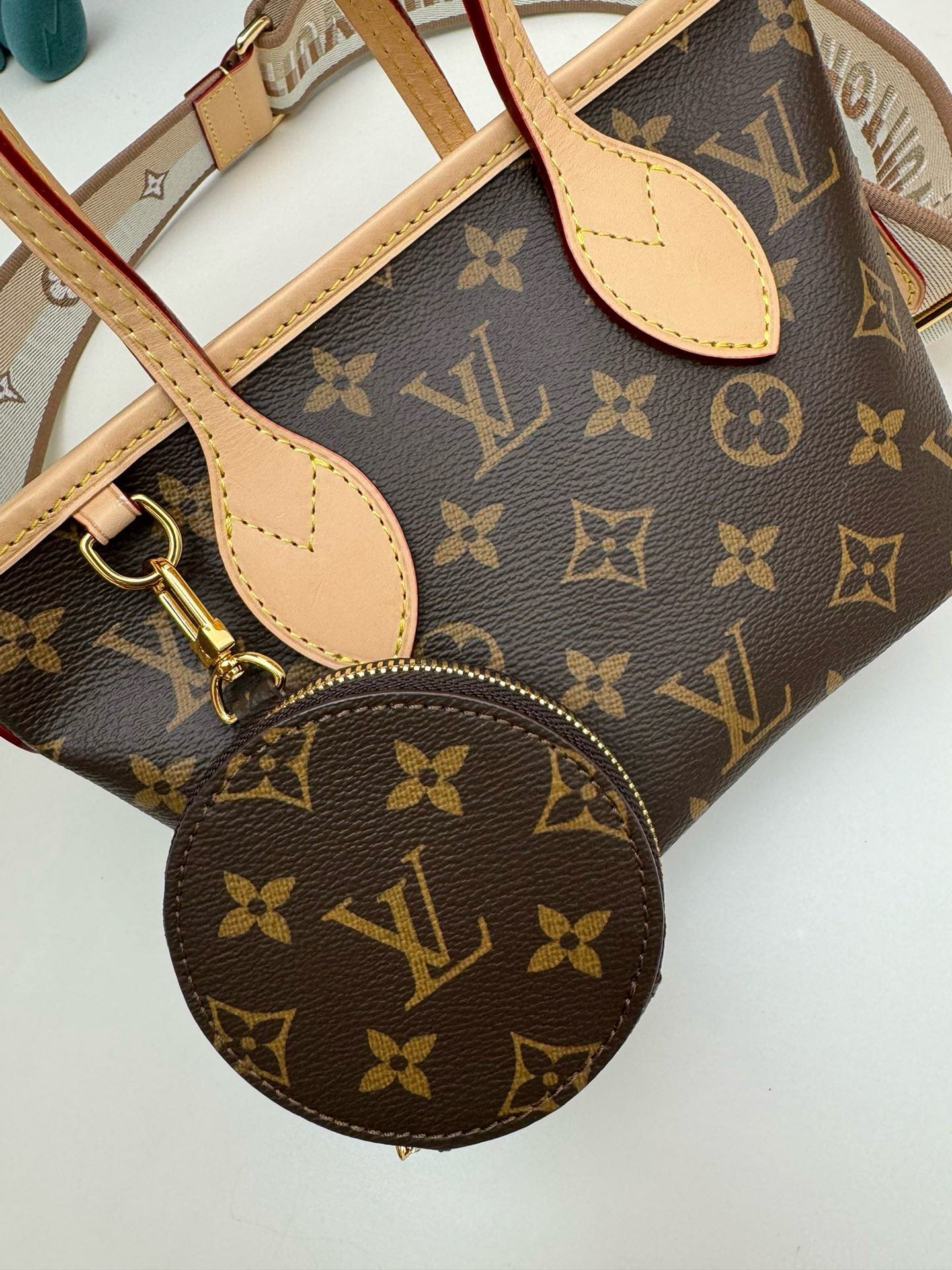 This season the House’s forever favorite, the Neverfull, gets reinvented as a mini-tote: the Neverfull BB handbag. This scaled-down version features an adjustable and detachable textile strap as well as a playful coin purse attached to a D-ring. It is just the right size for small essentials like a smartphone and compact wallet.