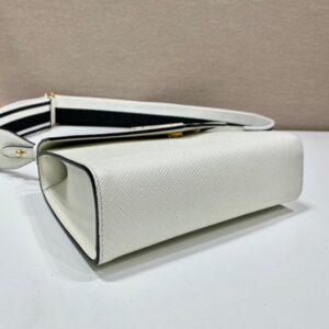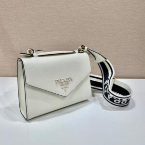 The refined design of the Prada Monochrome bag in Saffiano is emphasized by the tonal effect of the iconic logo. Clean elegant lines define the bag made versatile by the removable woven tape shoulder strap embroidered with the logo in a contrasting color.