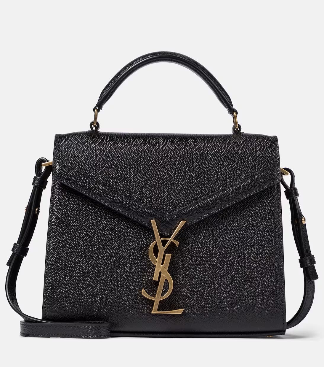 Strongly structured and cinched with golden turn-lock monogram hardware, the Cassandra Mini shoulder bag captures Saint Laurent’s polished aesthetic. Made from grained black calf leather, it boasts dual compartments and a card slot for effortless organization. Swing yours from the top handle for boardroom-ready styling.