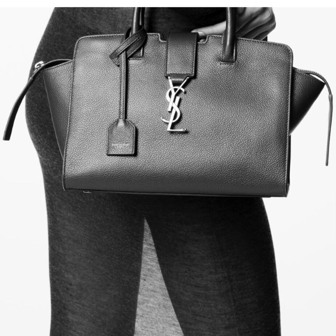 TUBULAR TOP HANDLE MONOGRAM SAINT LAURENT BAG WITH EXPANDABLE GUSSETED SIDE PANELS, LEATHER ENCASED KEY RING, INTERLOCKING YSL SIGNATURE BUCKLE CLOSURE AND REMOVABLE SHOULDER STRAP.