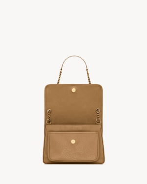 This spacious bag features multiple pockets, while a sliding leather-and-chain shoulder strap allows for both shoulder and crossbody carry options.